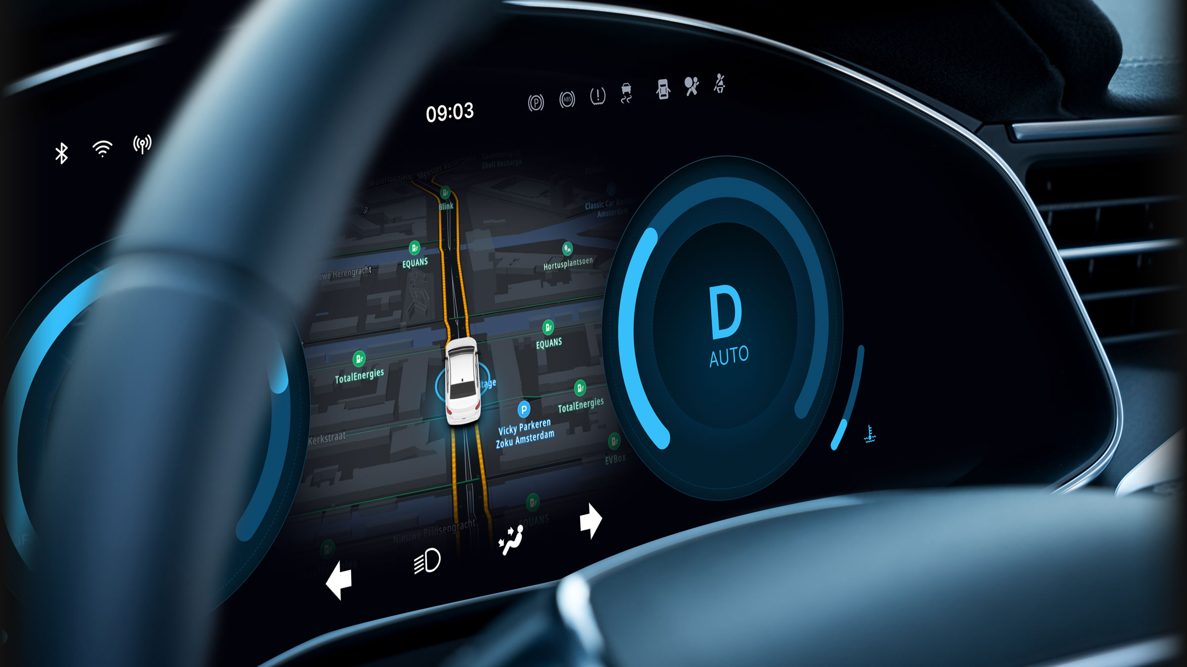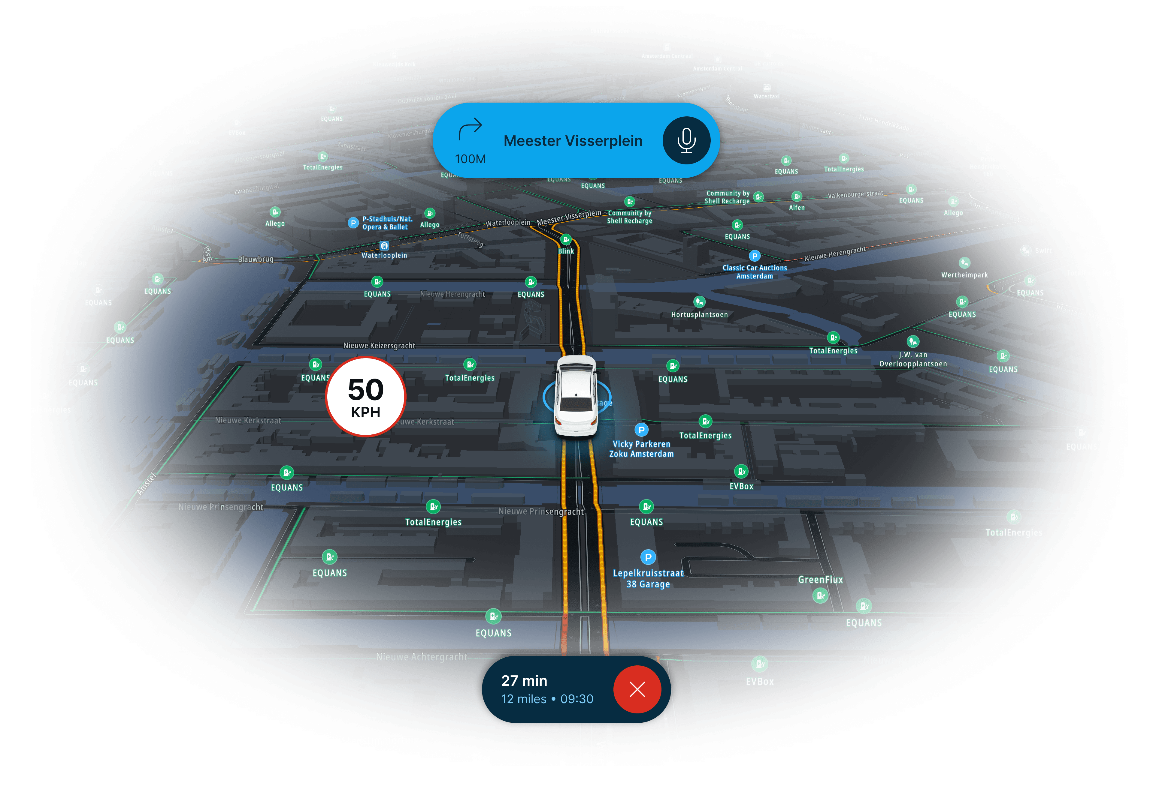 The navigation view prioritises glanceable information to minimise driver distraction, prioritising clear, high-contrast route guidance and route recommendations.