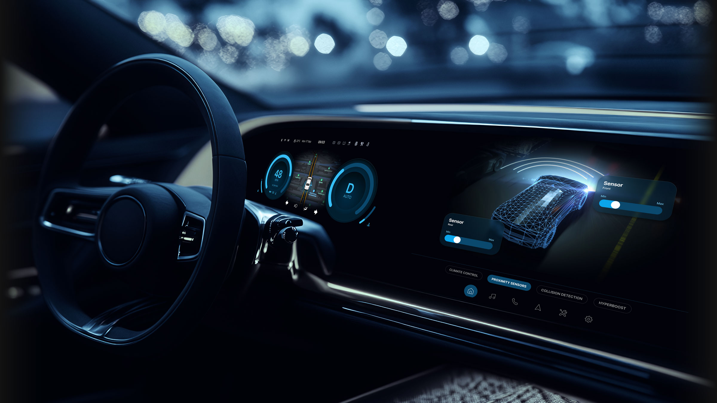 The dashboard concept allows drivers to tailor the interface to their priorities. The central portion of the dashboard can be toggled between multiple views while the main instrument cluster is fully customisable across various styles, allowing users to select various modern digital readouts with minimalistic aesthetics.